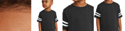 This football-style tee will have your toddler feeling like he's part of the team. 4.5-ounce, 100% combed ring spun cotton fine jersey 60/40 combed ring spun cotton/poly vintage heathered fine jersey (vintage colors) Ribbed collar Side seamed EasyTear label for additional comfort and ability to brand as your own Shoulder-to-shoulder taping Coverstitched front and back yoke Contrasting stripes on sleeves Double-needle sleeves and hem