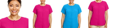 4.6 oz., 155 gsm; 100% polyester crepe; Hidden center front placket with dyed-to-match buttons; Double layer back yoke with center back pleat; Side slits; Always flattering Perfect Fit;