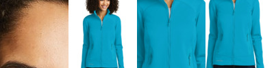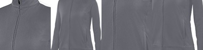 Heavyweight 100% polyester matte brushed tricot ; Ladies' fit ; Heat sealed label ; Center front zipper ; Contrast color inserts on collar and shoulder ; Set-in sleeves ; Front seam pockets ;