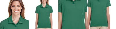 100% polyester heathered wicking knit top body, collar and sleeves ; 100% polyester wicking knit solid bottom body ; Wicks moisture away from the body ; Ladies' fit ; Pad print label ; Contrast self-fabric Johnny collar, placket, and yoke ; Contrast set-in sleeves ;