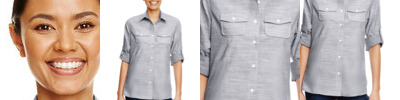3.3 oz. 55/45 cotton/polyester; 2 chest pockets, button flaps; Front stitching and on yoke; Blue & red have black inner collar; Hem sleeves and bottom; modern fit with roll up sleeve placket;
