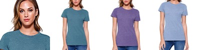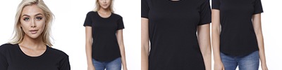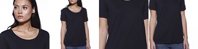 4.3 oz., 52% cotton 48% polyester, 30 singles; Ultra-fine cotton blend; Fashion fit; Side seams; Scooped neckline; Tear-away label; Made in a w.r.a.p. certified factory;