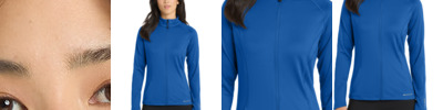 4.8 oz., 100% polyester mini-jacquard; Anti-bacterial; Moisture-wicking; Stain-resistant; UV 15-39 protection; Feminine fit; Flat-knit collar;
