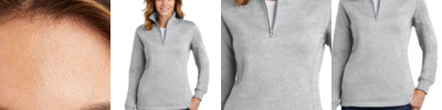 A stylish feminine fit and flatlock stitching details make this sweatshirt stand out. A rib knit cadet collar and 1/4-zip add to its appeal. Colorfast with minimal shrinkage, this casual essential is made to last.