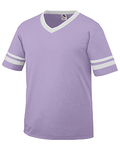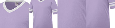 4.8 ounce 50% polyester/50% cotton jersey knit * Crew neck * Contrast color neck and sleeves * Raglan sleeves * Serged fishtail bottom